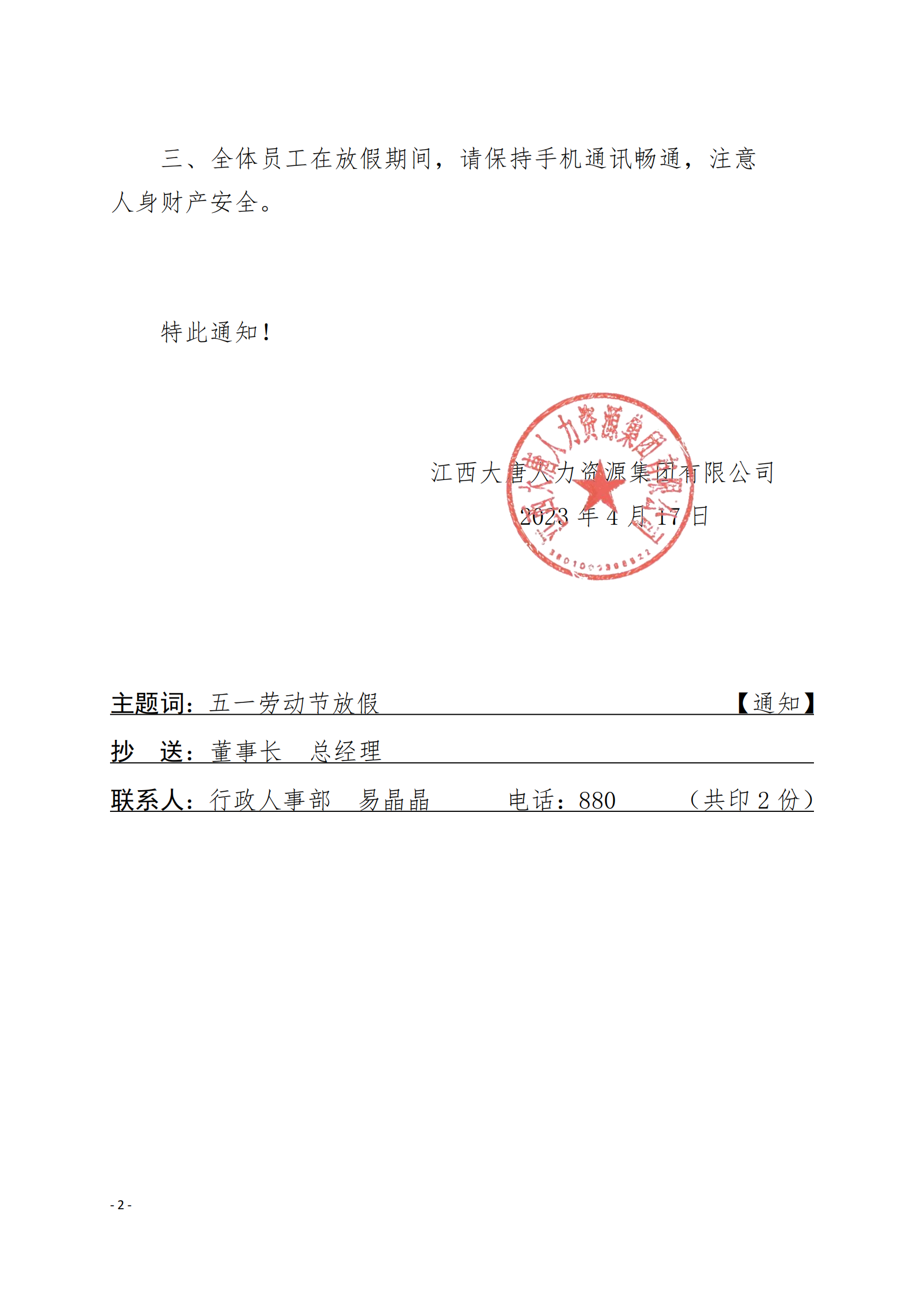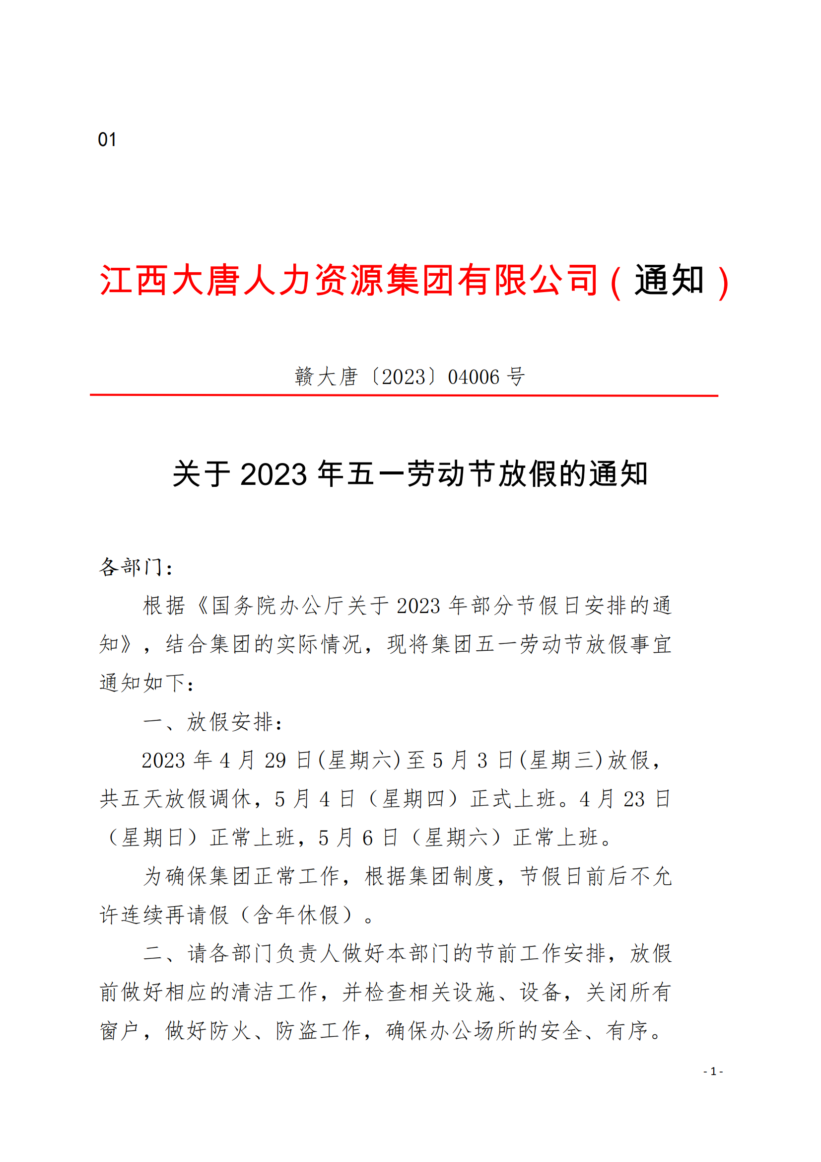 集團(tuán)關(guān)于2023年五一勞動節(jié)放假的通知